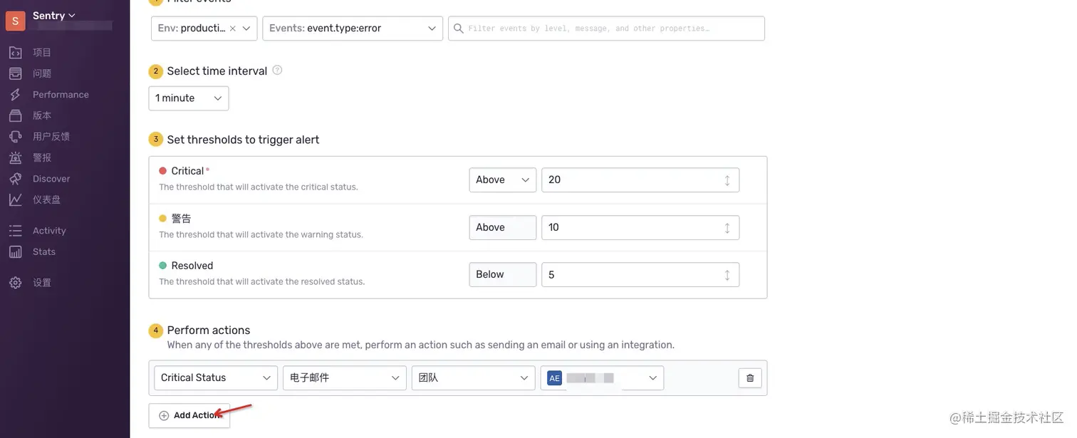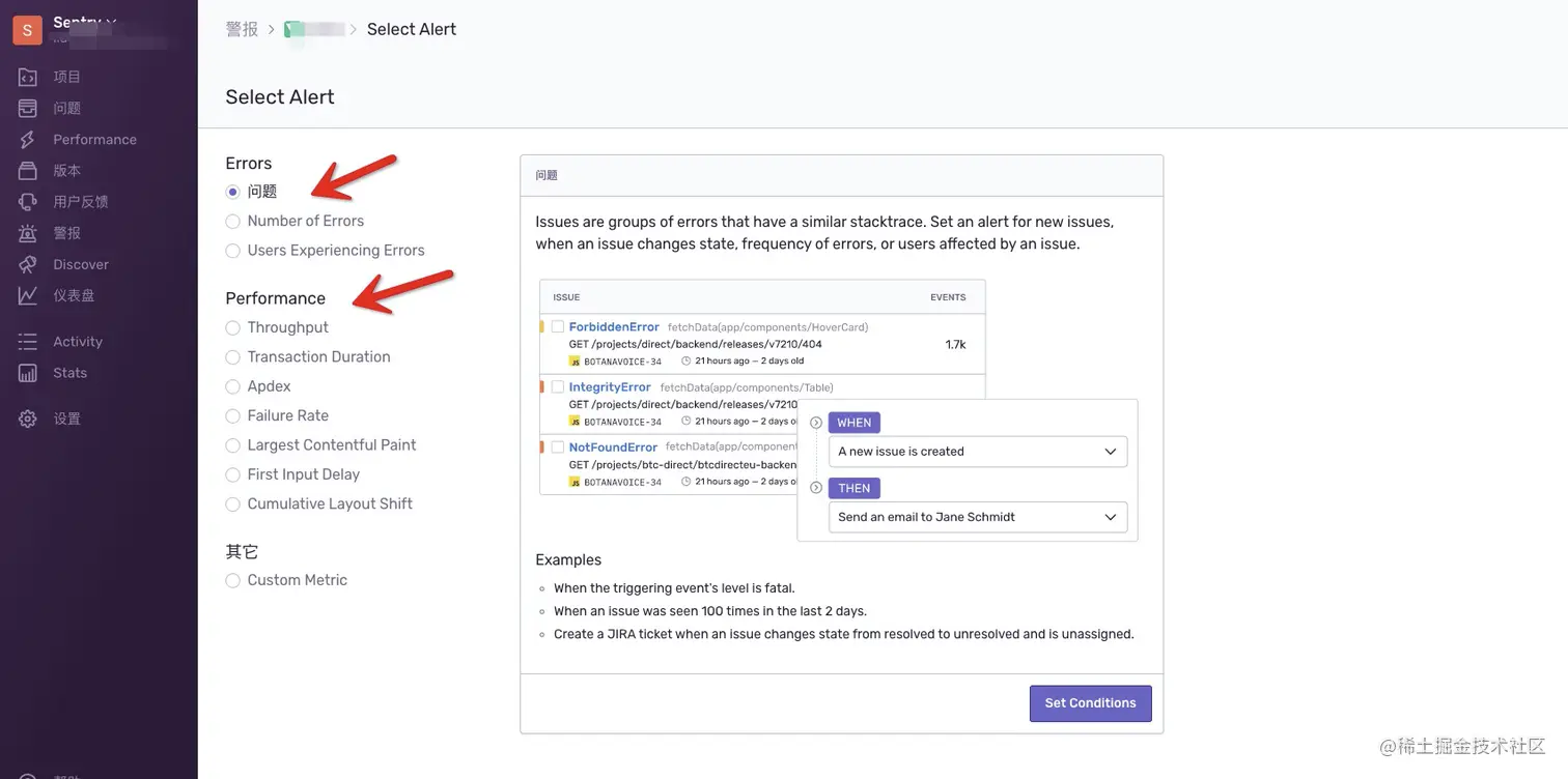 设置报警规则,当我们某些情况,如 issues,performance 超过我们设置的阈值,会触发 alert。
