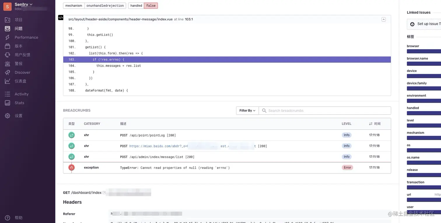 此外还可以通过 BreadCrumbs 功能查看,报错前发生了什么操作
