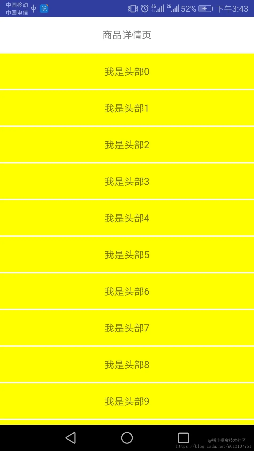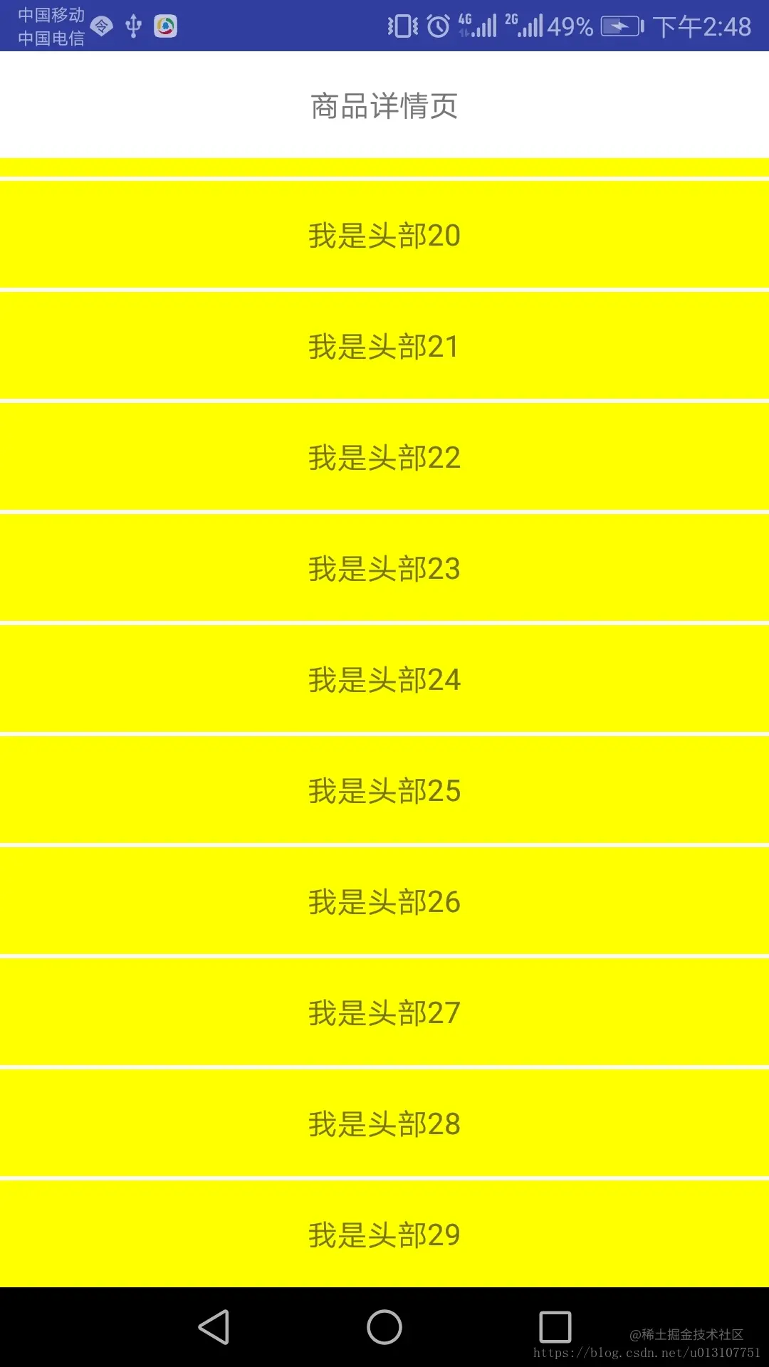 我们发现,只显示了头部的RecyclerView的数据,底部的拉不出来,这是为什么呢?别急,我们这不是还有两个重写的方法没实现的吗,我们现在来写一下onInterceptTouchEvent和onTouchEvent这两个方法