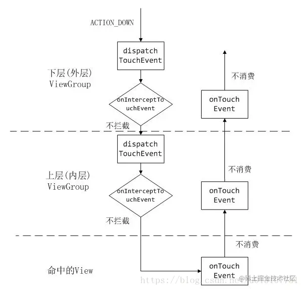 我们发现时间都是从最外层的ViewGroup的dispatchTouchEvent -> onInterceptTouchEvent一层层往里传的,但是到onTouchEvent事件的时候又是从里一层层往外传的?