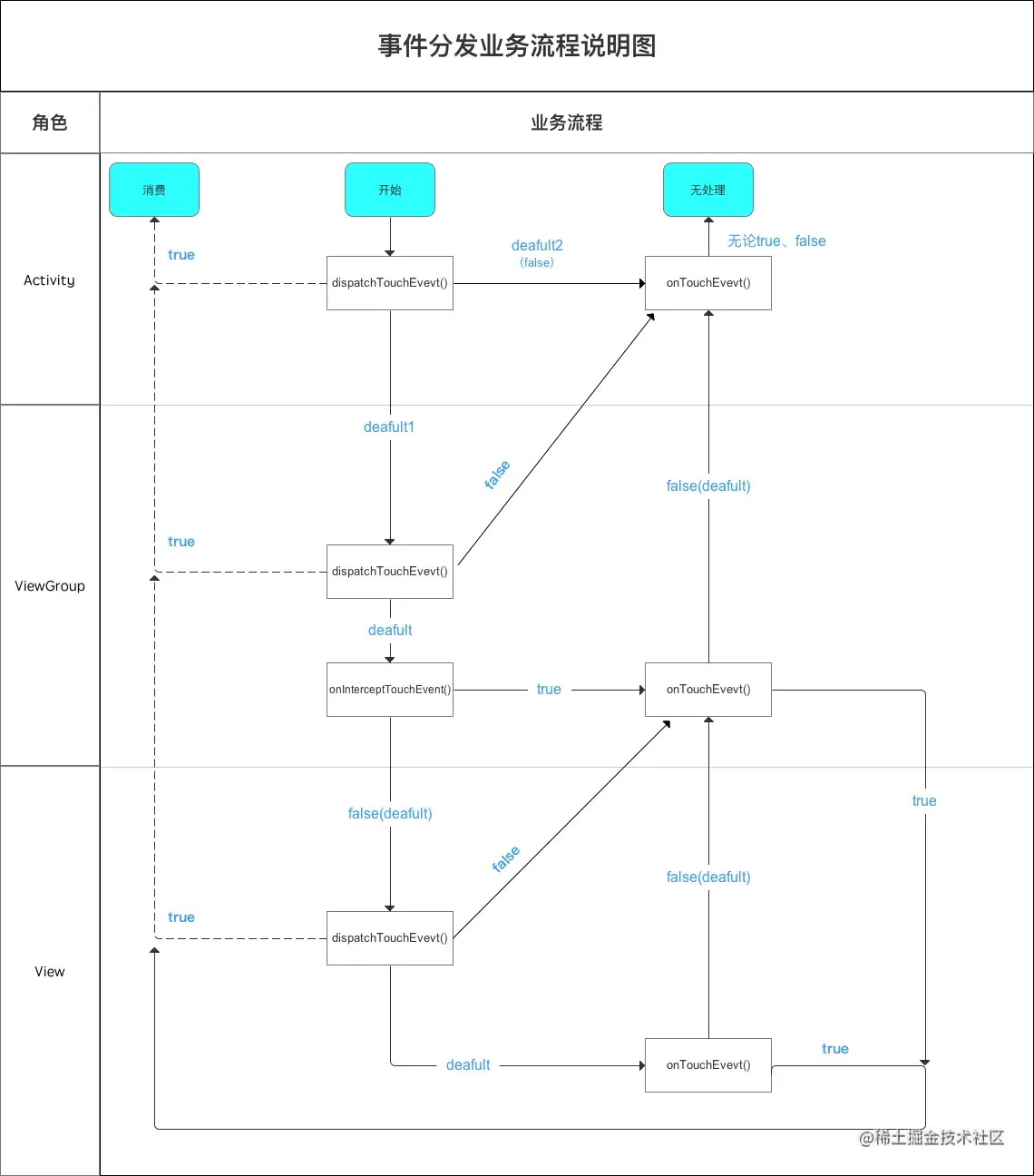 这里盗用一张别人的图总结一下,当我们手指触摸到控件的时候,事件会从最外层的ViewGroup的dispatchTouchEvent开始判断自己的onInterceptTouchEvent要不要拦截处理事件,如果要拦截则返回true,交给自己的onTouchEvent处理,如果返回false则查找子View的dispatchTouchEvent这样循环调用,直到有子View拦截事件为止,如果都没人处理的话又会从子View的onTouchEvent一层层往回传.有点像双亲委派机制?