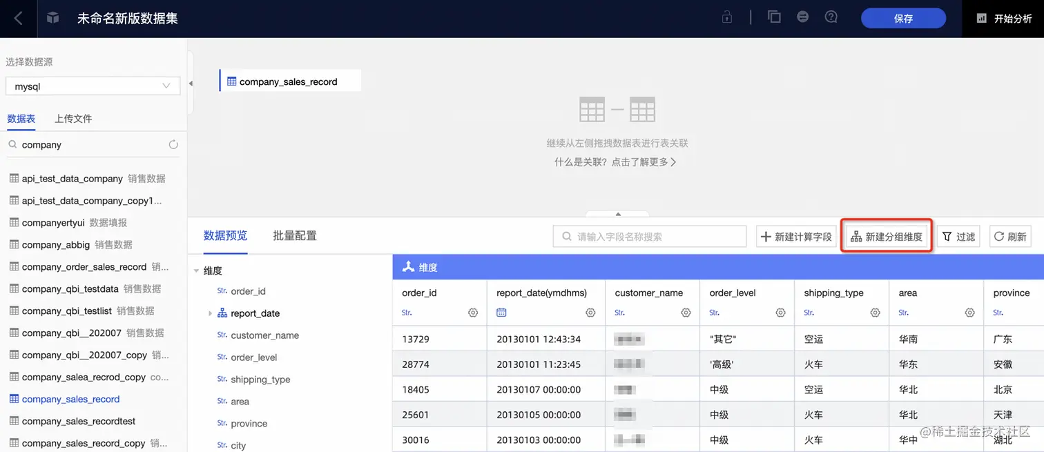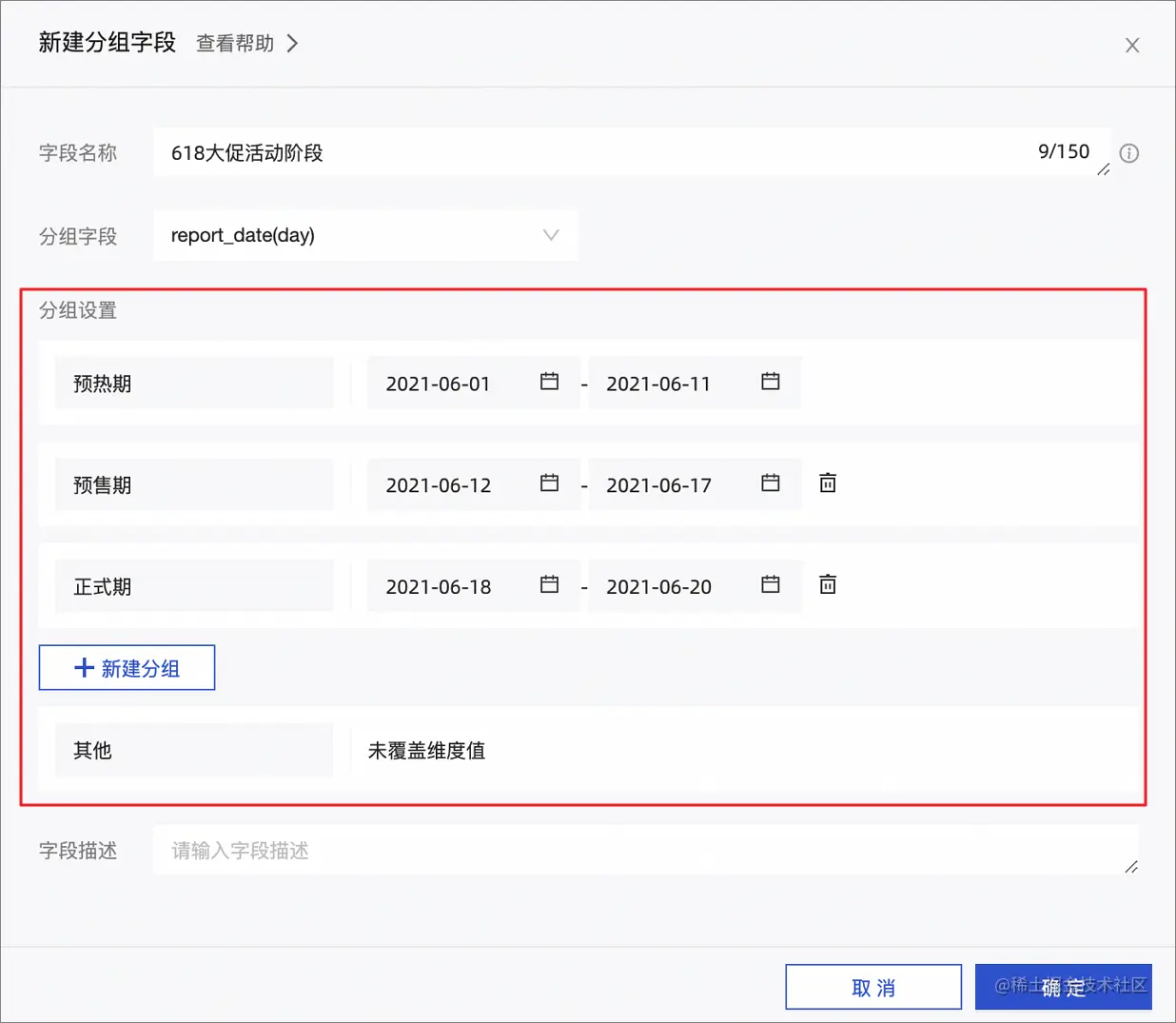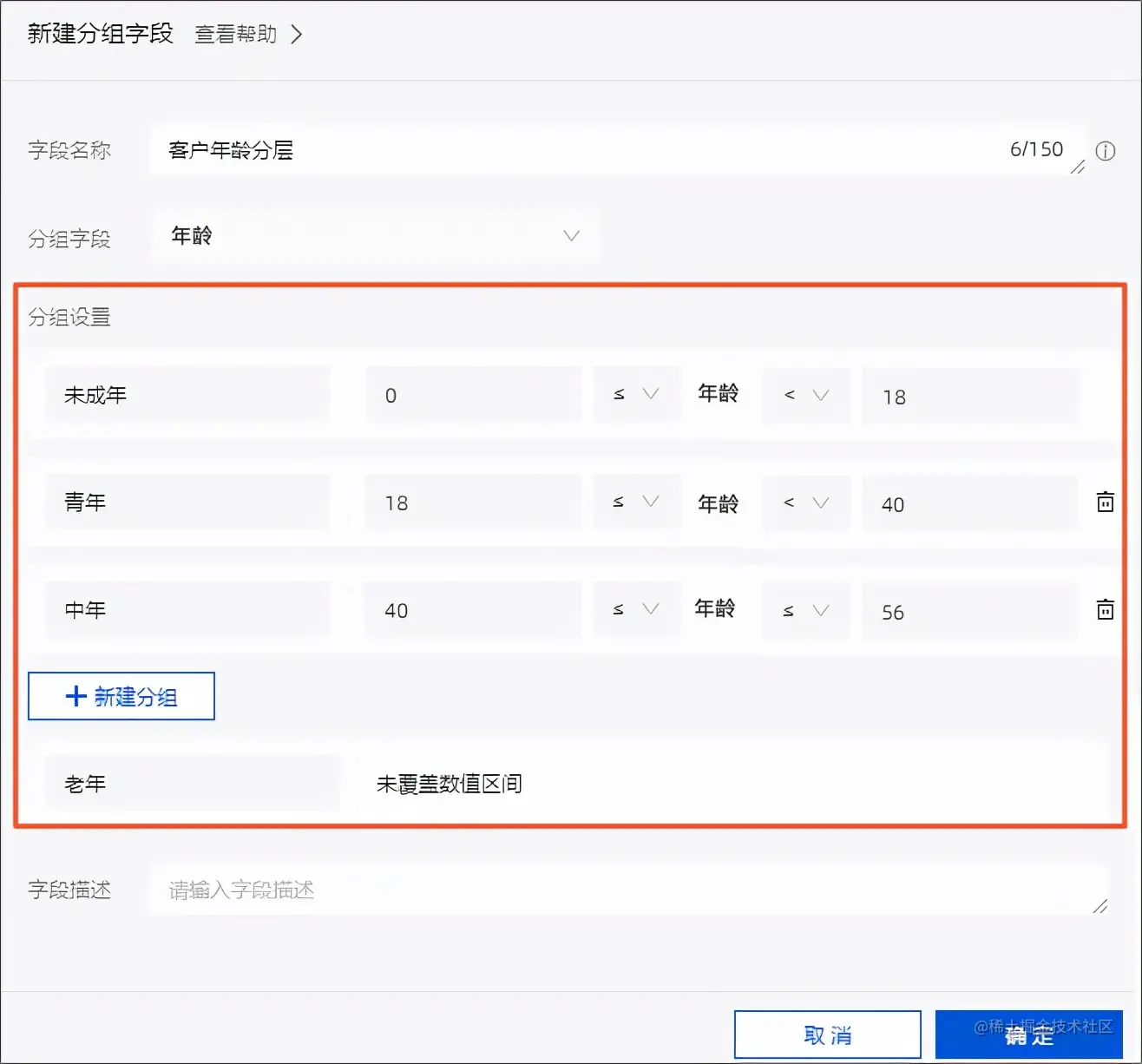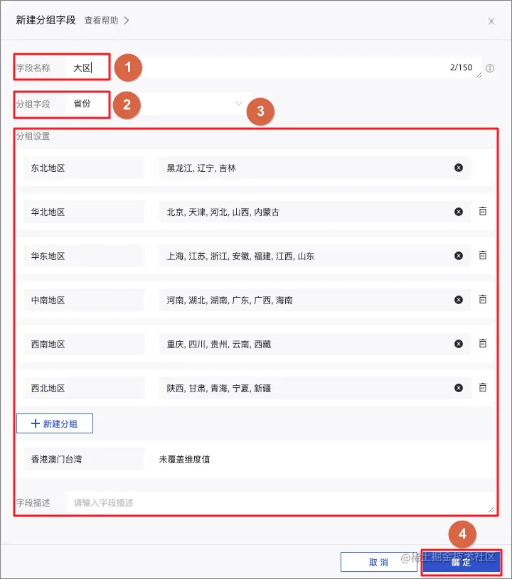 - 在新建分组字段对话框,按照以下步骤配置后,单击确定。(支持应用在地理分组、年龄分组、日期分组等场景)