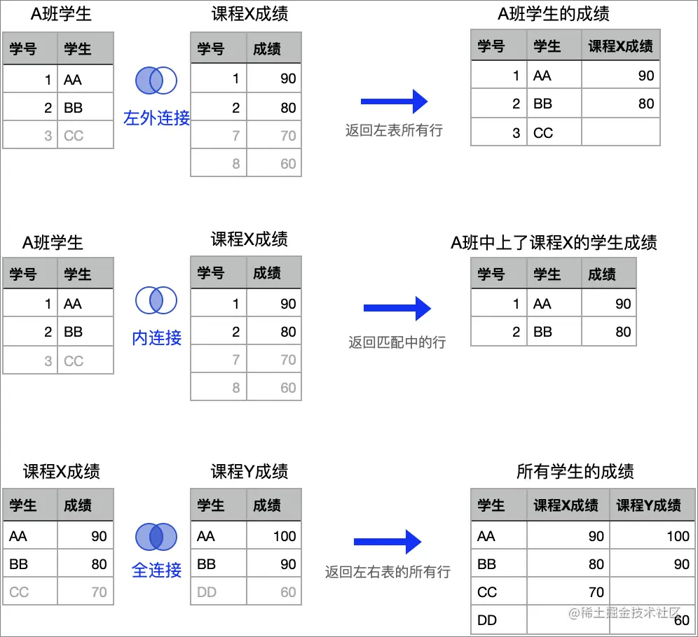 ◼内连接(inner join):通过id将左表和右表连接起来产生一个新表,新表是由这个表的交集部分组成;
