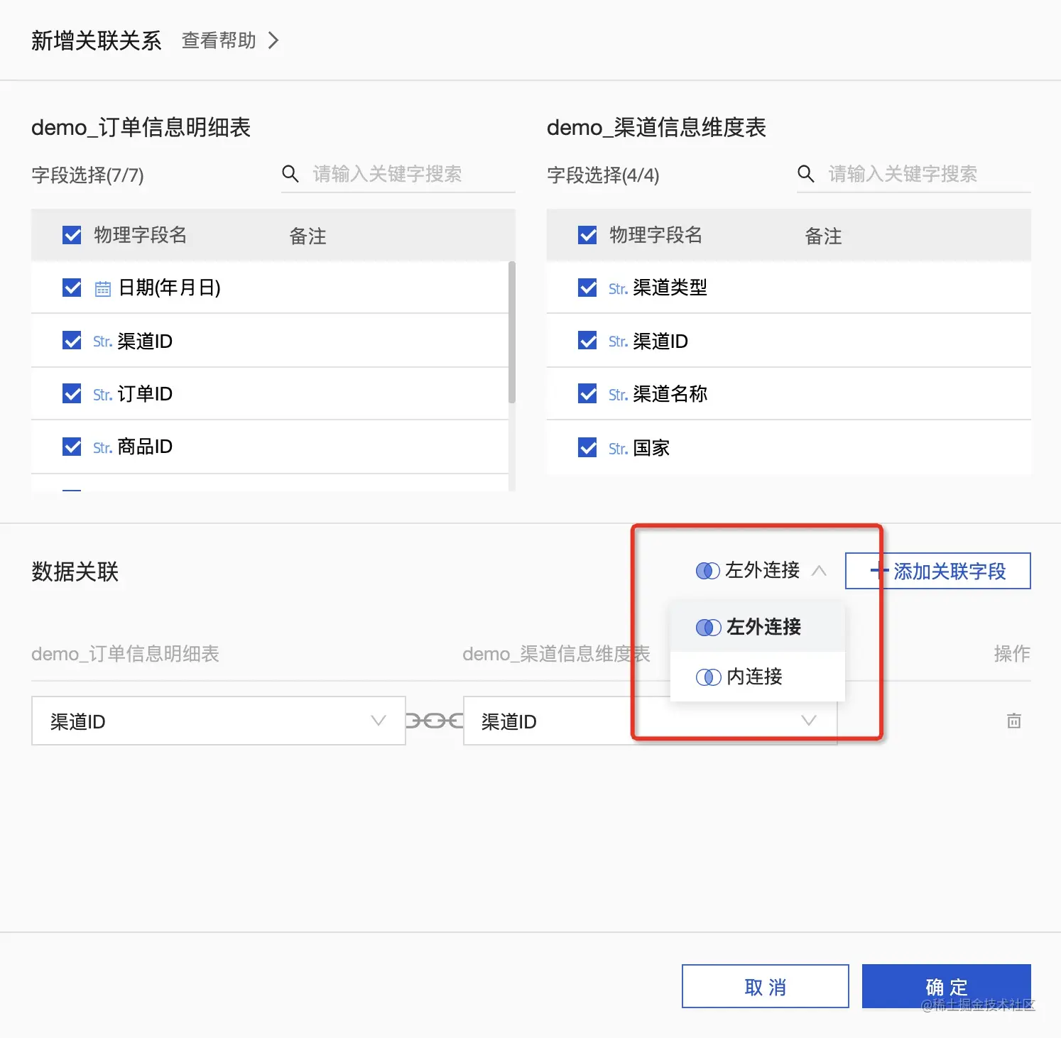 您需要通过不同报表中都具备的相同字段来进行关联。如「demo_订单信息明细表」和「demo_渠道信息维度表」中都包含共同字段「渠道ID」,选择「渠道ID」来进行数据关联,就可以获取包含订单信息和渠道信息的完整表单。方便后续分析数据。