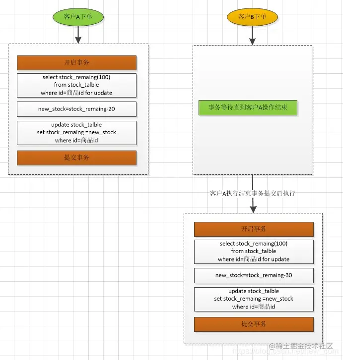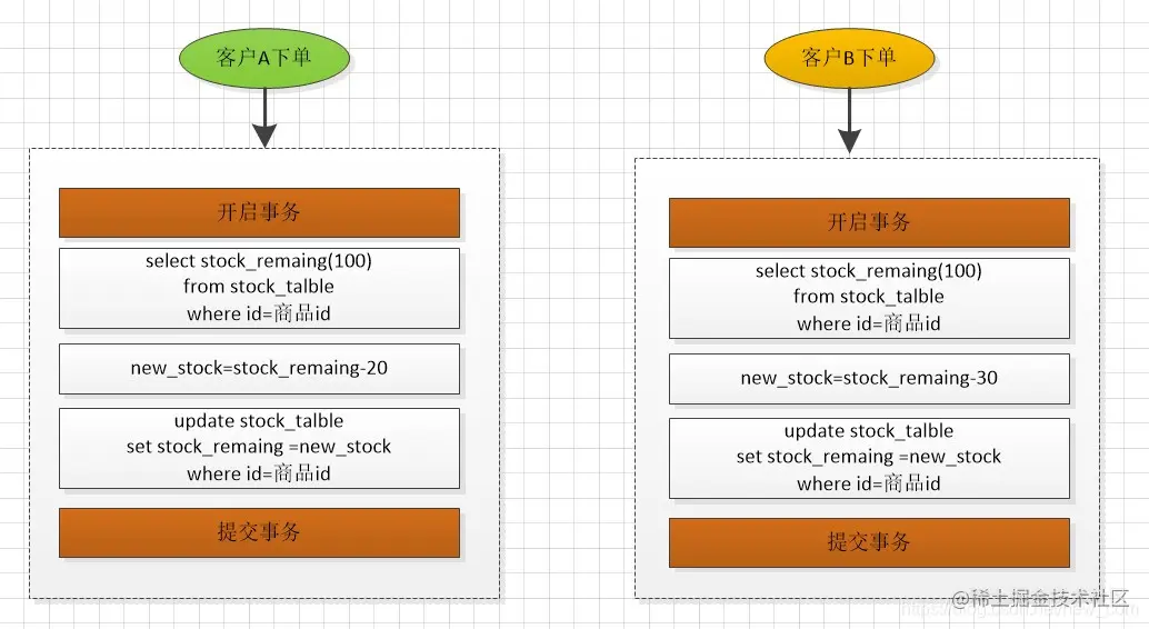 假设,商品的剩余库存stock_remaing 为100,客户A下单20,客户B下单30,在并发扣库存的时候,可能存在超卖。如果客户A和客户B同时获取剩余库存为100,则会出现事务后提交的值会覆盖前一个客户提交的值,有可能剩余的库存是80或者70。