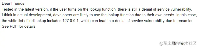 大致阅读CVE-2021-45046相关的信息后,发现和我提交的DOS漏洞略有不同,但核心部分是一致的