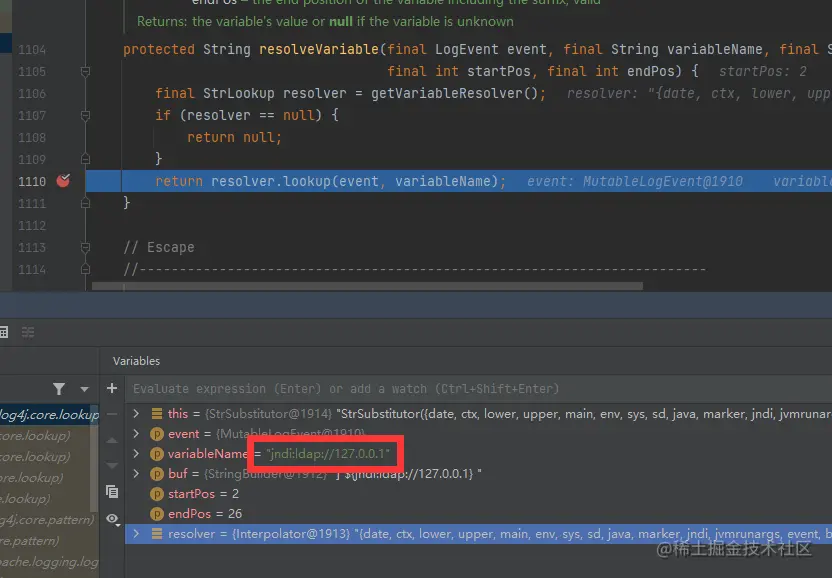 protected String resolveVariable ( final LogEvent event , final String variableName , final StringBuilder buf ,