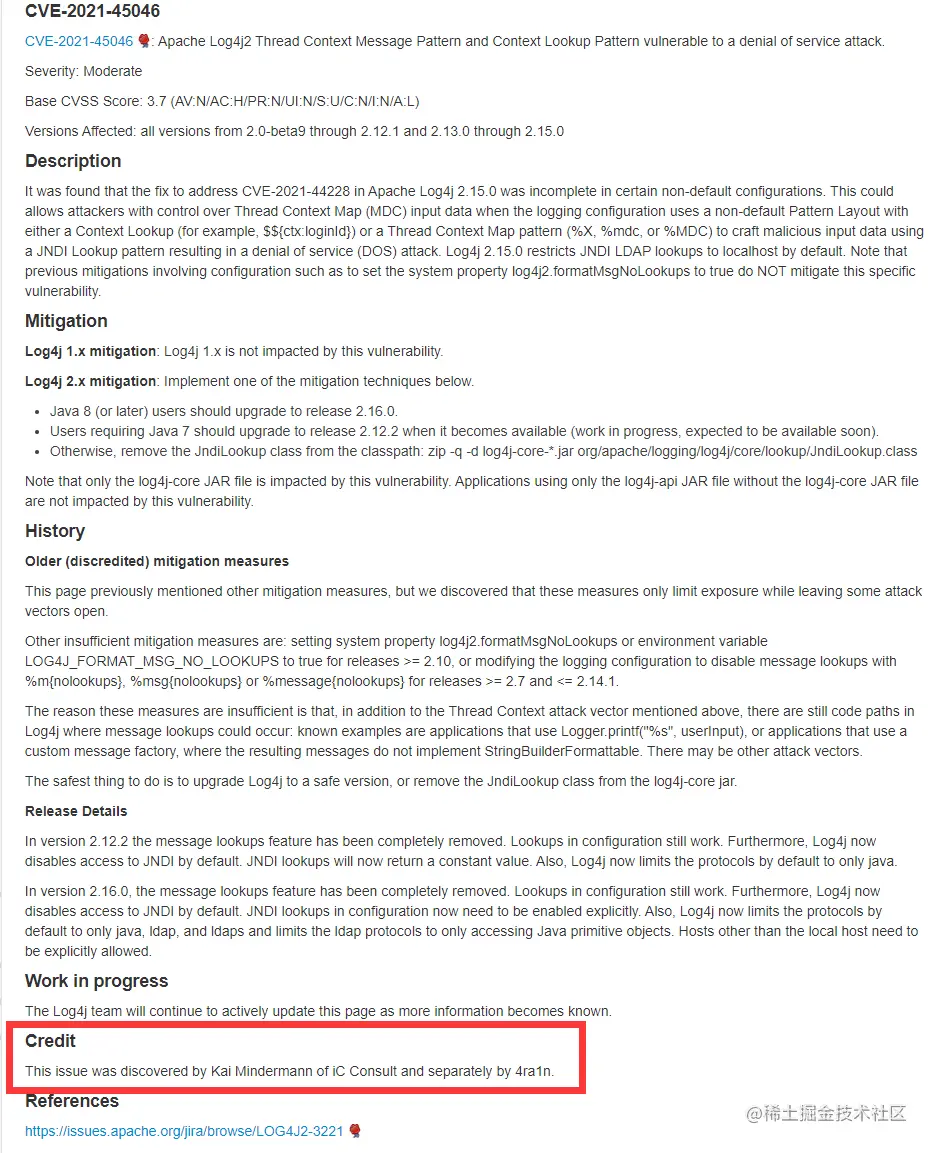其实当时没有想过申请CVE等步骤,但在今天早上看到了Log4j2发布了CVE-2021-45046漏洞报告,这个CVE正是拒绝服务相关,不过漏洞credit信息并不是我,而是国外某团队
