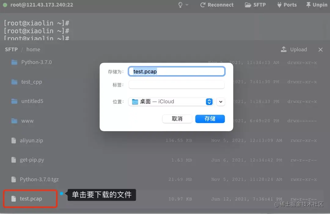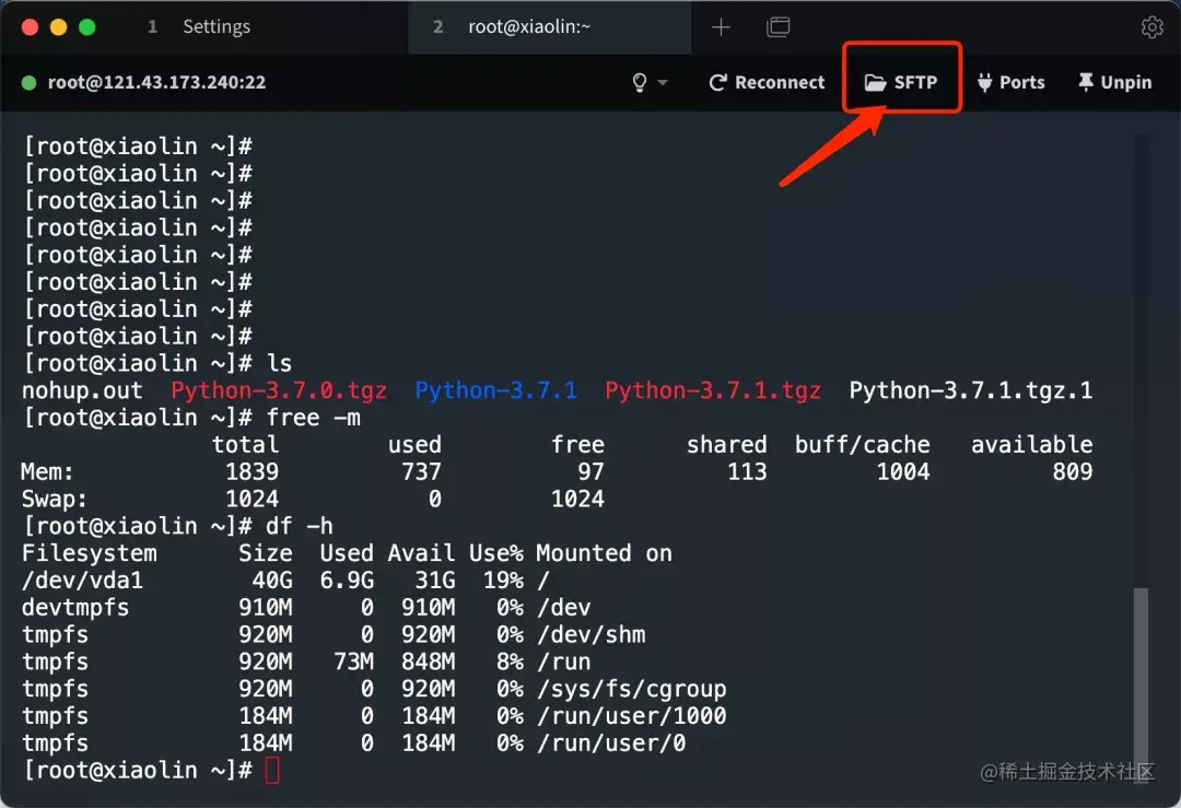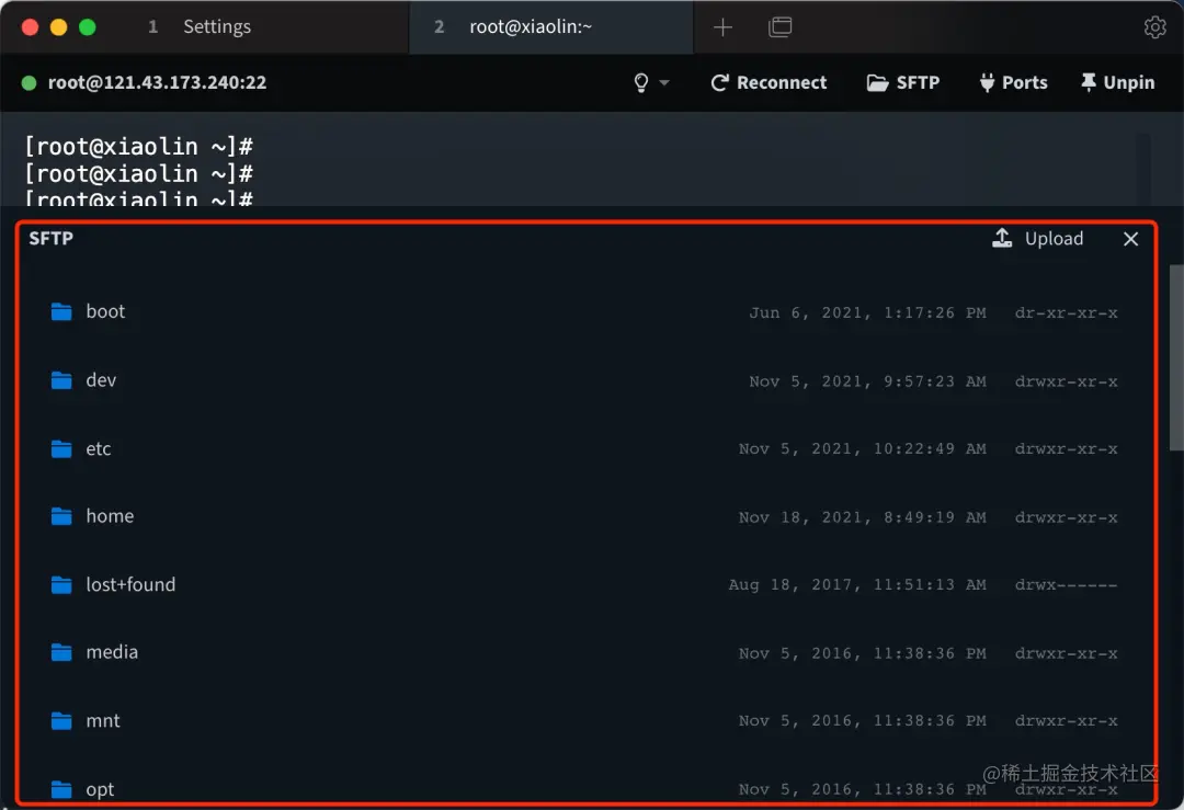 前面也介绍过,这款终端工具是自带 SFTP 功能的。要使用的话,直接点击下图中的 SFTP 图标就行。