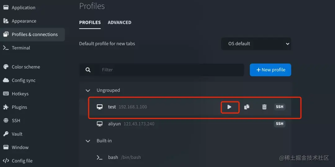 进入到设置页面后,选择 profiles&connections 这个选项,然后点击「New profile」新建一个终端配置。