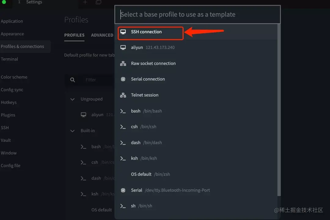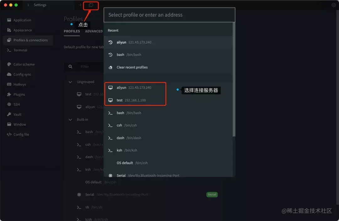 所以,要想新建一个连接服务器的终端,要点击「Settings」,进入到配置页面。