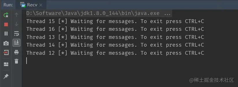 可以看到发送到rabbitmq的三条消息,成功被消费者消费(5个消费者争抢着消费,一条消息只会被一个消费者消费,此种模式下,rabbitmq会依次将消息推送给消费者,根据下图可以观察到,消费者的启动顺序为15,16,13,14,12。rabbitmq也按照这个顺序(轮询,Round-Robin)依次把消息交给对应的消费者进行消费)