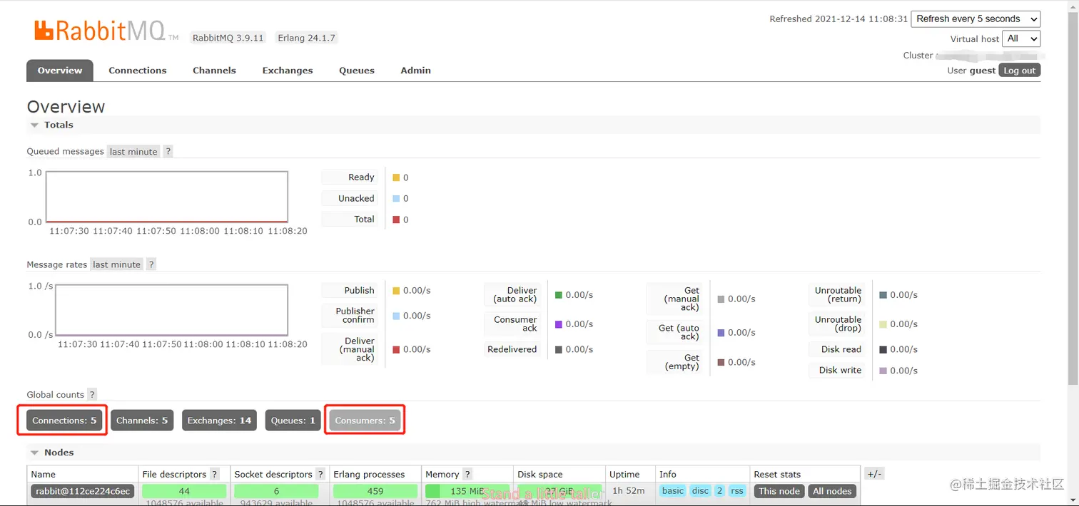http://127.0.0.1:15672,便能看到rabbitmq的情况rabbit会创建一个默认的用户,用户名