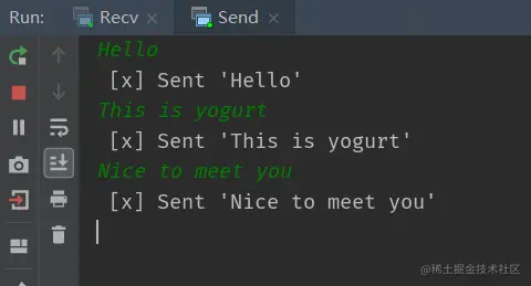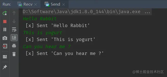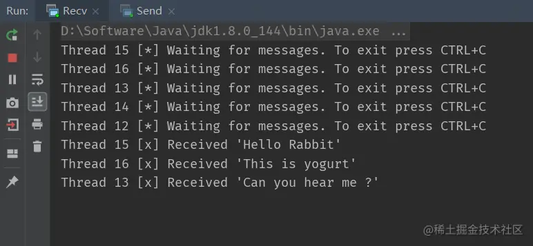 package com.yogurt.demo.rabbit; import com.rabbitmq.client.Channel; import com.rabbitmq.client.Connection; import com.rabbitmq.client.ConnectionFactory; import com.rabbitmq.client.DeliverCallback; import java.nio.charset.StandardCharsets; import static com.yogurt.demo.rabbit.Constants.*; /** * @Author yogurtzzz * @Date 2021/12/14 9:42 **/ public class Recv { public static void main(String[] args) { ConnectionFactory factory = new ConnectionFactory(); factory.setHost(RABBIT_IP); factory.setPort(RABBIT_PORT); factory.setUsername(RABBIT_USER); factory.setPassword(RABBIT_PASSWORD); // 获取连接 Connection connection = null; try { connection = factory.newConnection(); Channel channel = connection.createChannel(); channel.queueDeclare(RABBIT_QUEUE_NAME, false, false, false, null); System.out.println(" [*] Waiting for messages. To exit press CTRL+C"); DeliverCallback deliverCallback = (consumerTag, delivery) -> { String message = new String(delivery.getBody(), StandardCharsets.UTF_8); System.out.println(" [x] Received '" + message + "'"); }; channel.basicConsume(RABBIT_QUEUE_NAME, true, deliverCallback, consumerTag -> { }); } catch (Exception e) { e.printStackTrace(); } } }跑起来!
