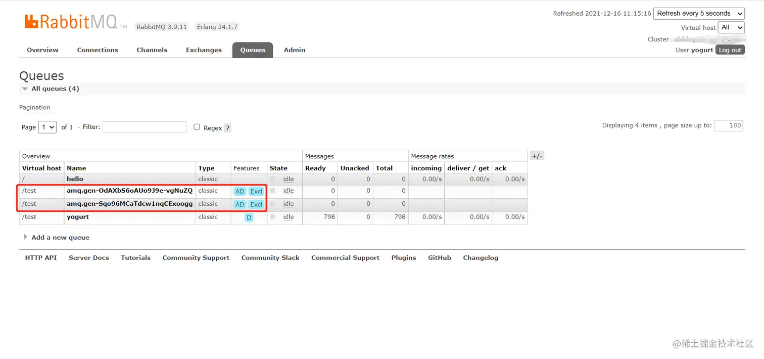 进入管理界面,能够看到已经创建了2个临时queue