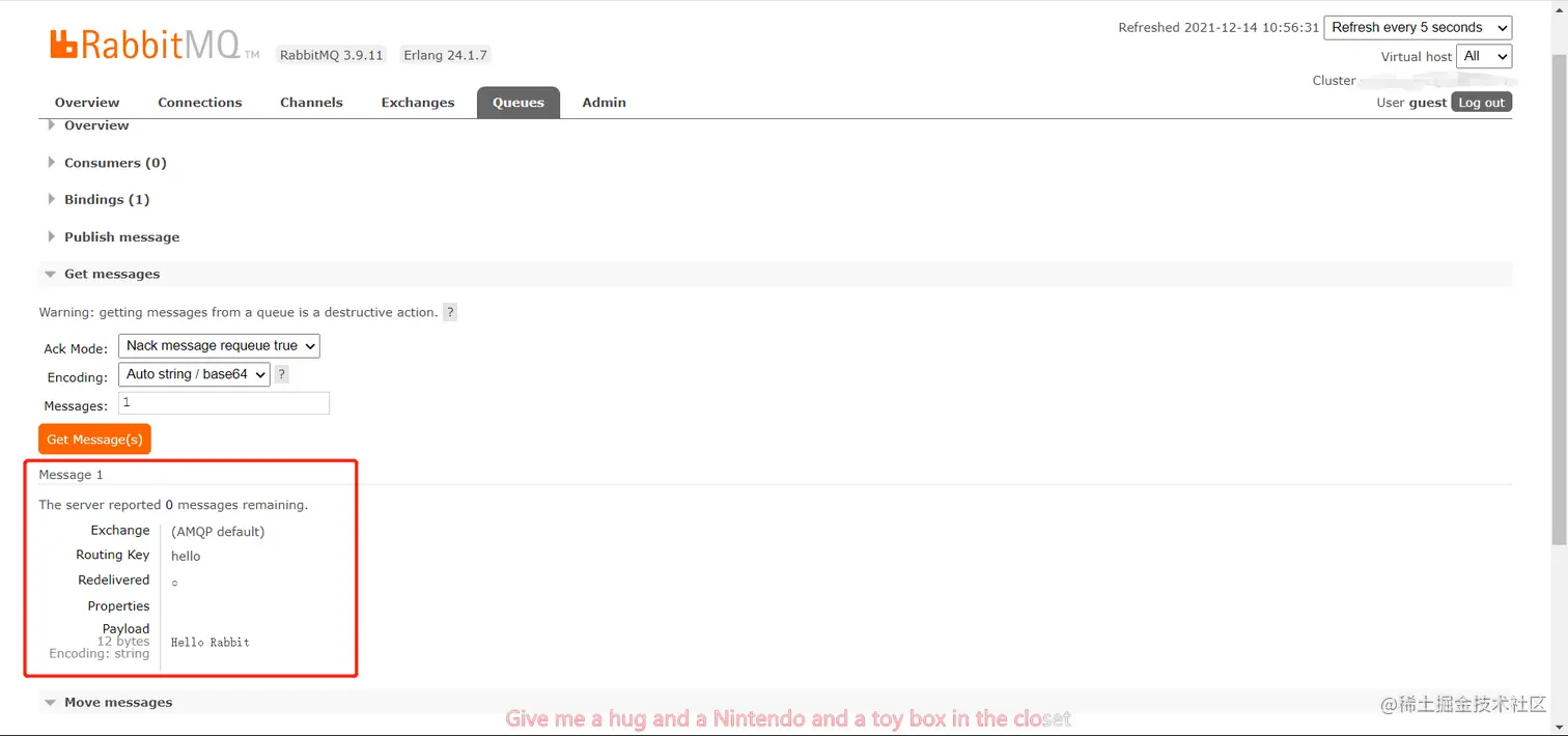 hello的队列中,有1条消息,我们可以点击队列的名称,然后点击Get Messages,获取队列中的消息,可以看到这条消息的内容是Hello Rabbit说明消息成功发送到rabbitmq当中了