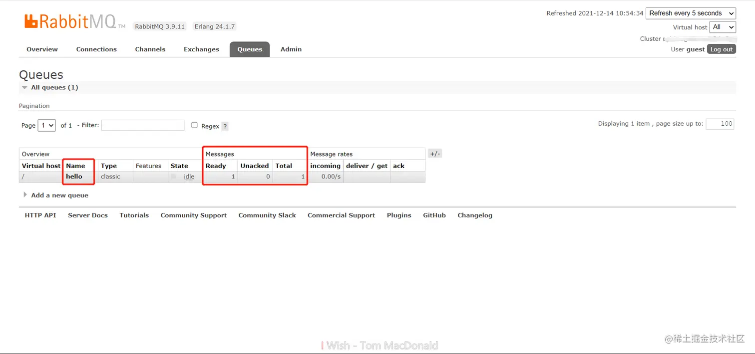 package com.yogurt.demo.rabbit; import com.rabbitmq.client.Channel; import com.rabbitmq.client.Connection; import com.rabbitmq.client.ConnectionFactory; import java.io.BufferedReader; import java.io.InputStreamReader; import java.nio.charset.StandardCharsets; import static com.yogurt.demo.rabbit.Constants.*; public class Send { public static void main(String[] argv) throws Exception { // 连接工厂 ConnectionFactory factory = new ConnectionFactory(); // 设置连接信息, ip, 端口号, 账号, 密码 factory.setHost(RABBIT_IP); factory.setPort(RABBIT_PORT); factory.setUsername(RABBIT_USER); factory.setPassword(RABBIT_PASSWORD); // 创建连接, 发送消息 (使用try-with-resource) try (Connection connection = factory.newConnection()) { String message = "Hello Rabbit"; Channel channel = connection.createChannel(); //如果该名称的队列不存在, 则新建一个 channel.queueDeclare(RABBIT_QUEUE_NAME, false, false, false, null); // 向该队列发送一条消息 channel.basicPublish("", RABBIT_QUEUE_NAME, null, message.getBytes(StandardCharsets.UTF_8)); System.out.println(" [x] Sent '" + message + "'"); } } }跑起来!