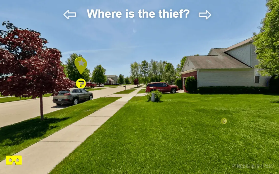 左右滑动屏幕,找到 3D 全景场景中的 交互点 并点击,找出嫌疑人真正躲藏的位置。