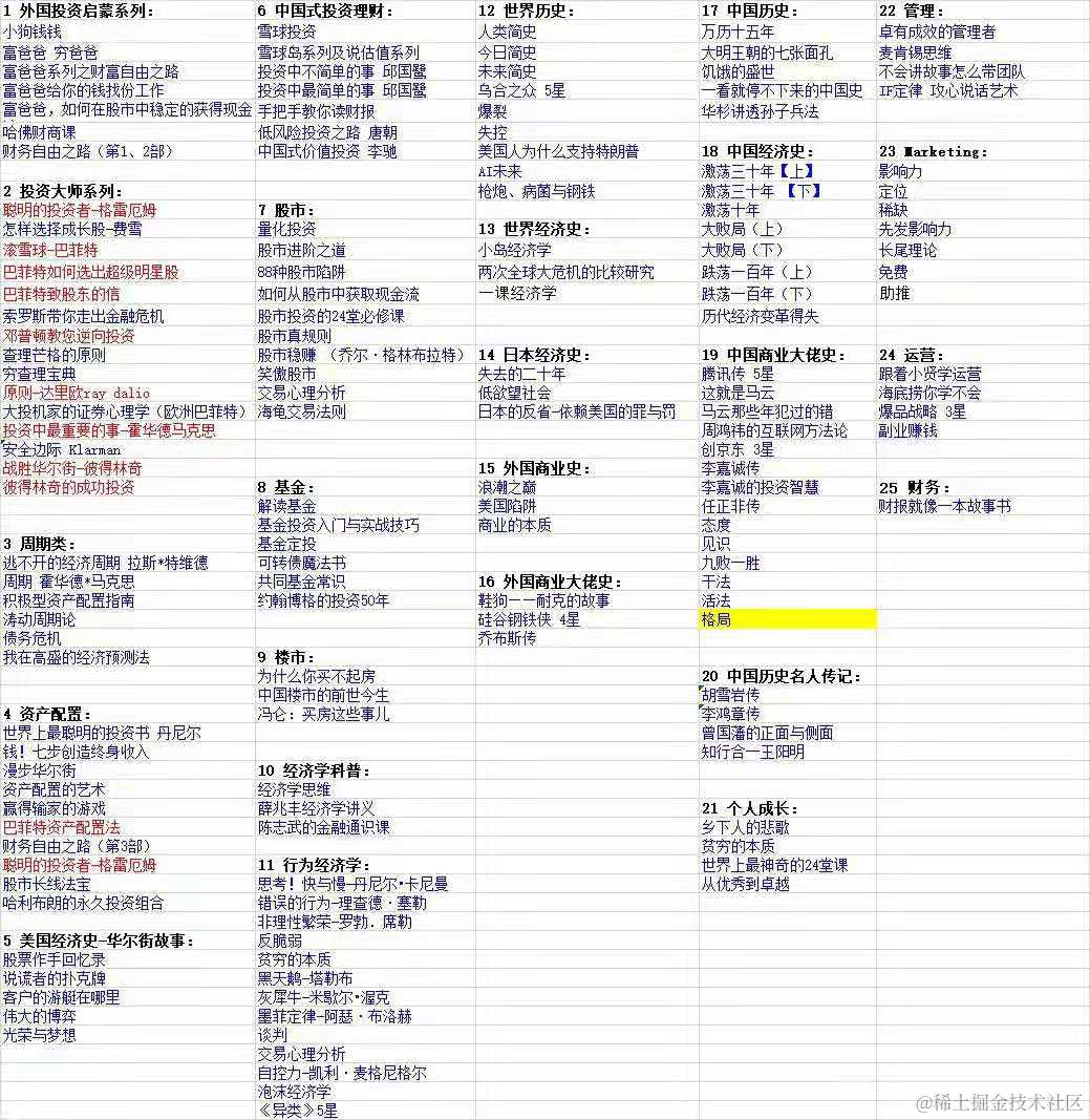 这里仅仅提供书籍的名称,根据书名可以在书店或者网上找一下电子书,对个人的财富增长有很大推动作用。这个一本本的看可能时间来不了,可以找基本典型的好好读一下,比如富爸爸与穷爸爸,雪球投资。滚雪球等。