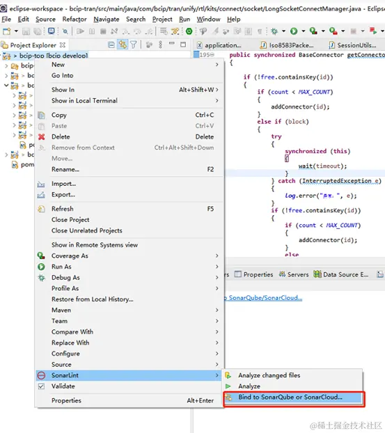 1) 项目目录树上点击右键,选择【Sonar】->【Bind toSonarQube or SonarCloud...】: