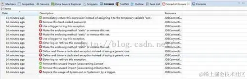 打开需要进行代码审查的java或js文件,SonarLint将会自动进行代码审查,在控制台输出审查结果,如下图所示: