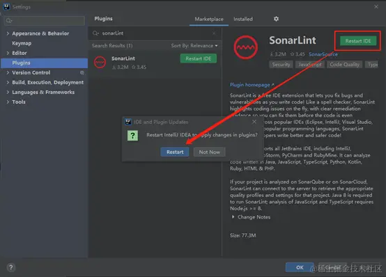 点击【In'stall】安装,安装完成后,点击【Restart IDE】: