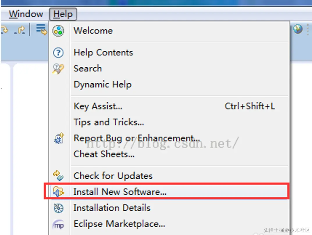 在Eclipse菜单栏中找到Help栏,选择Help->InstallNew Software,如下图所示: