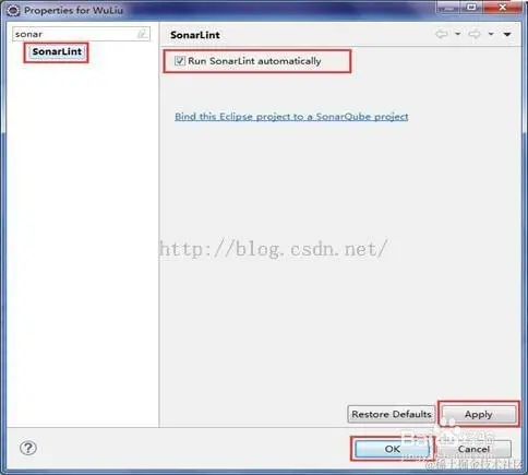 SonarLint默认在打开文件的时候自动进行代码审查。如果不想使用自动审查,设置方法:右键单击项目->Properties->SonarLint->取消“Run SonarLint automatically”->Apply->OK,如下图所示:
