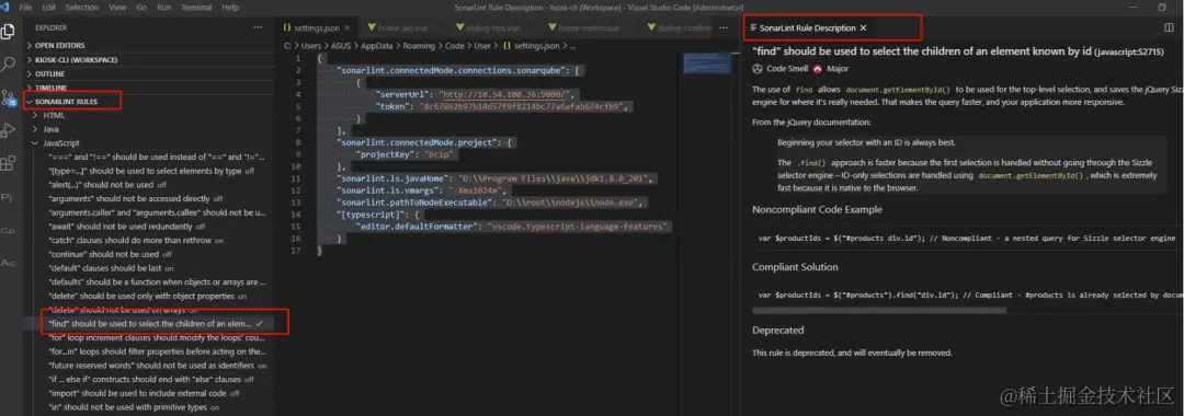 插件默认使用本地默认的审查规则,可通过增加连接SonarQube或者SonarCloud的配置,实现联动服务端的统⼀配置,统⼀审查标准,具体配置如下```json{"sonarlint.connectedMode.connections.sonarqube": [ {"serverUrl": "http://10.54.100.36:9000/","token": "8c67862b97b10d57f8f8214bc77a6afab674cfb9", } ],"sonarlint.connectedMode.project": {"projectKey": "bcip" },"sonarlint.ls.javaHome": "D:\\Program Files\\java\\jdk1.8.0_201","sonarlint.ls.vmargs": "-Xmx1024m","sonarlint.pathToNodeExecutable": "D:\\root\\nodejs\\node.exe",}``