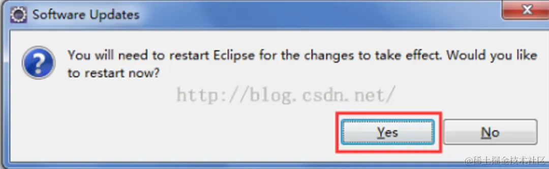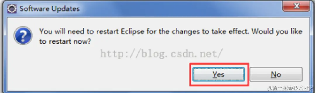 安装成功后,会弹出“SoftwareUpdates”界面提示需要重启Eclipse使安装生效,点击“Yes”,重启之后就可以使用了,如下图所示: