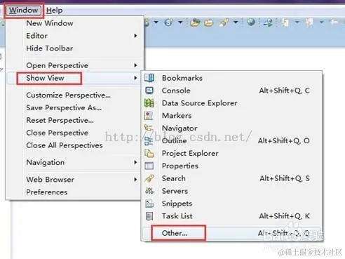 Eclipse工具栏选择Window->Show View->other,如下图所示: