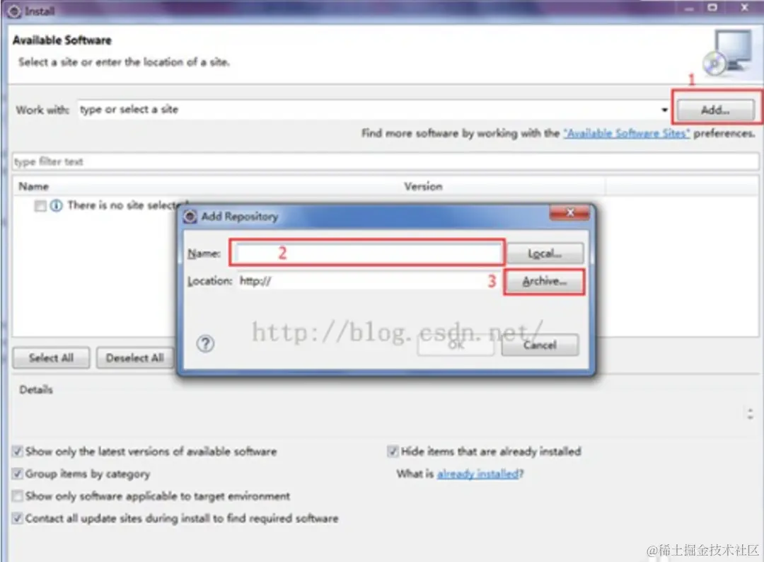 弹出Install界面,点击“Add”,弹出“AddRepository”界面,自定义一个name,点击Archive,选择已下载的zip文件,点击OK进行安装,如下图所示: