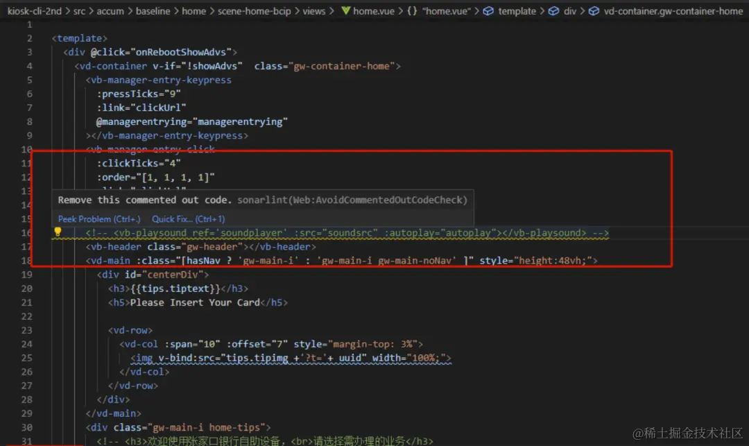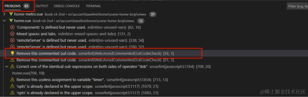 审查文件 打开js、vue等文件,⾃动在Problems中显⽰此文件审查存在的问题,同时,在问题出可悬浮提示审查规则及订正方法