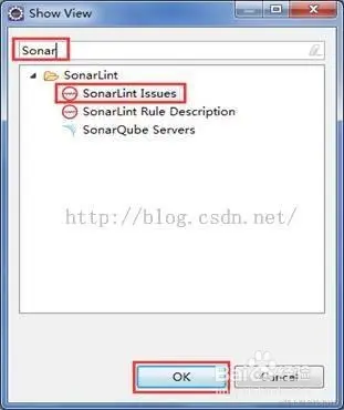 弹出“Show View”界面,输入Sonar,选择“SonarLintIssues”点击“OK”,如下图所示: