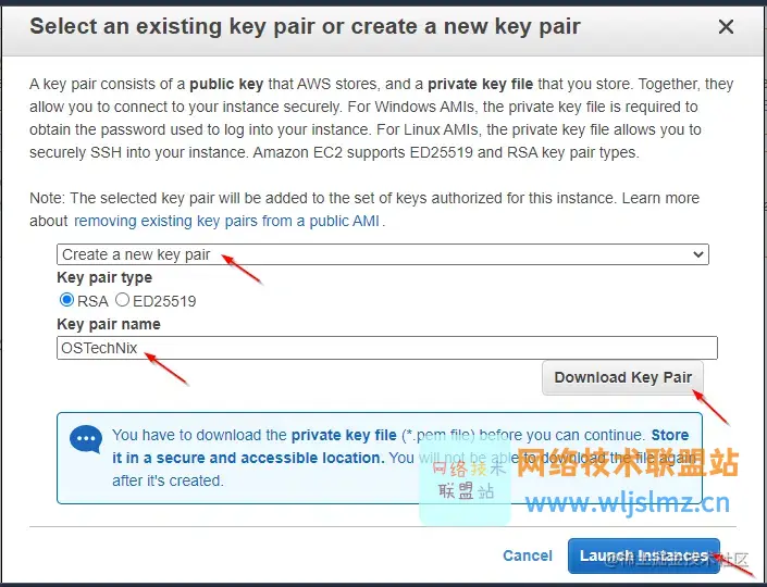 在此屏幕中,系统会提示您选择现有的密钥对或创建新的密钥对,要通过 SSH 安全地访问您的 Linux 实例,您需要一个密钥对。这个密钥对就像 Lock 和 Key。