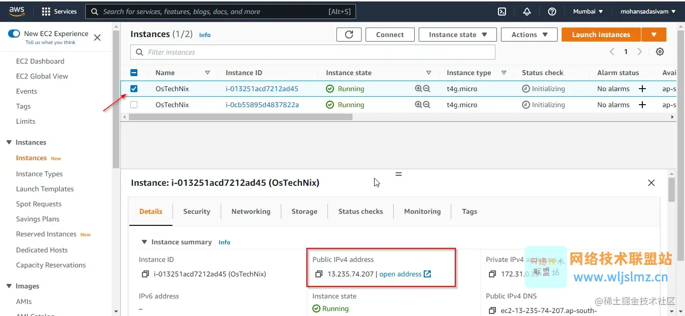从 AWS 控制台获取实例的公共 IP 地址,选择实例,您可以在底部获取实例的所有详细信息。