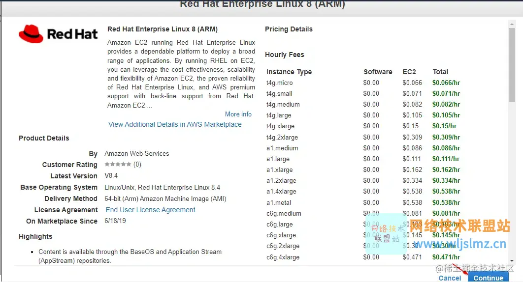 在下一页中,您可以查看每种实例类型的定价详细信息。您可以了解预算并相应地决定实例类型。单击继续以继续。