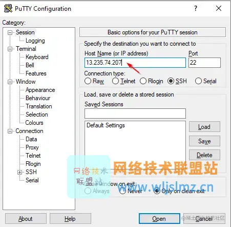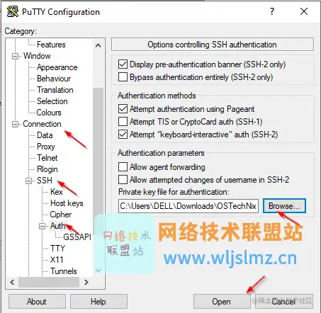 输入 IP 后,在连接选项卡下选择SSH。单击“Auth”并加载您在上一步中下载的密钥(文件),您可以从存储文件的位置浏览和加载。最后点击“打开”连接服务器。.ppk.ppk