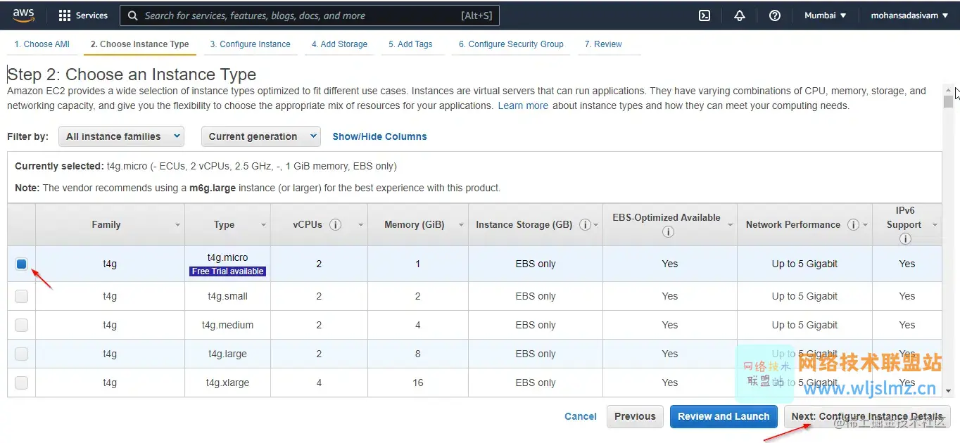 出于演示目的,我们将启动t4g.micro 实例,它由2 个 vCPU和1GB RAM 组成。选择实例后,单击底部的“配置实例详细信息”按钮以进一步操作。