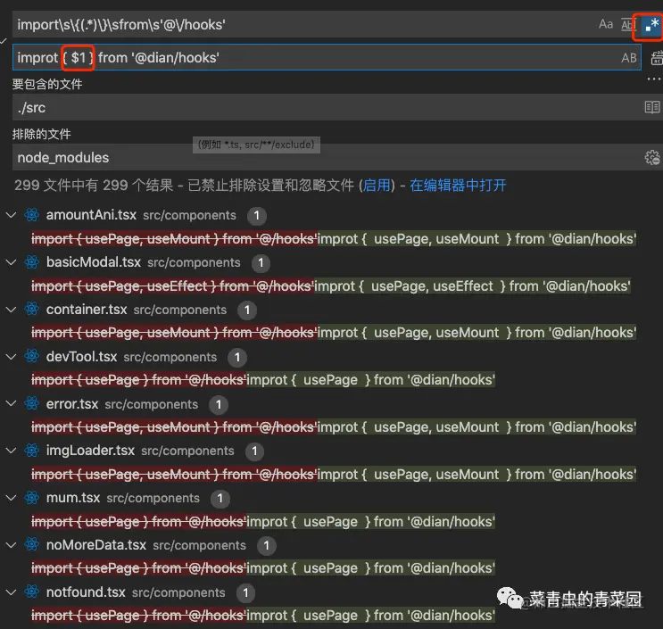 @/hooks直接替换为@dian/hooks即可,确实是这样,但是如果要对其中的方法进行过滤时,替换尾部就不好解决了。此时可在正则中进行过滤。此方法也可进行预览,来实时查看是否正则满足条件。