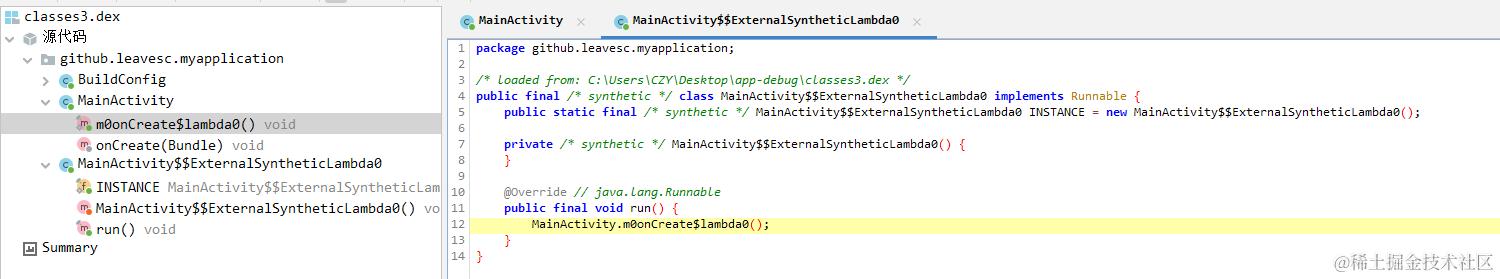可以写一个简单的 Android 应用来进行验证,随便写一段 lambda 表达式,然后反编译其 dex 文件,就可以看到 lambda 表达式在编译后的 dex 文件中就已经是直接以实现类的形式存在的了
