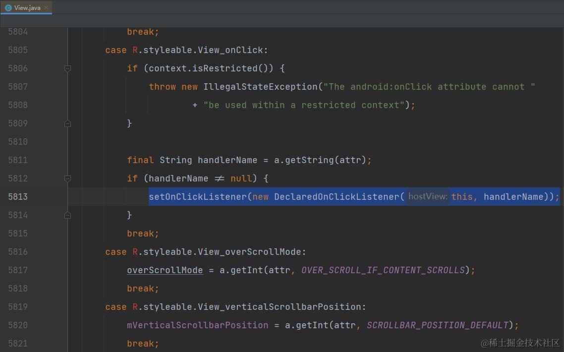 在 XML 中声明的 onClick 属性会在 View 类解析 AttributeSet 时进行读取,View 类会为其设置一个自定义的 OnClickListener,通过反射 handlerName 方法的形式来实现回调