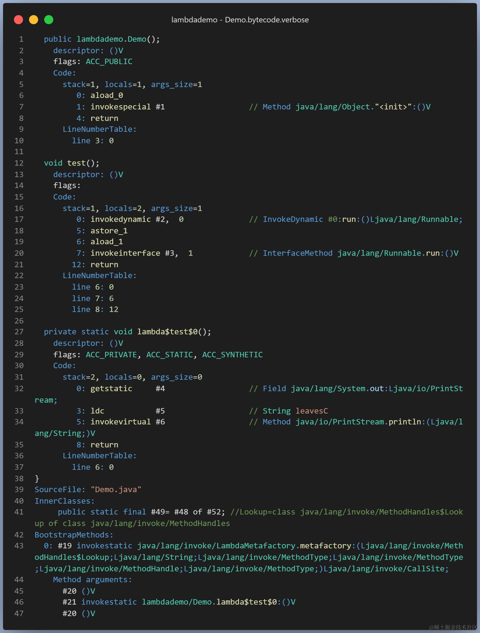 而 invokedynamic 是在 Java 7 中新增的字节码调用指令,作为 Java 支持动态类型语言的改进之一,在 Java 8 开始应用,lambda 表达式底层就依靠该指令来实现。invokedynamic 指令在常量池中并没有包含其目标方法的具体符号信息,存储的是 BootstapMethod 信息,在运行时再来通过引导方法机制动态确定方法的所属者和类型