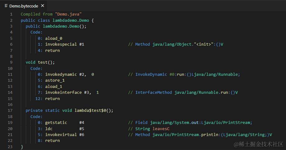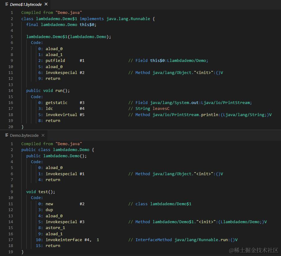 Demo$1.class的 run 方法中 - lambda 方式下,声明 Runnable 变量这个操作对应的是 invokedynamic、astore_1 等指令。Runnable 所要执行的代码块是在自动生成的私有静态方法