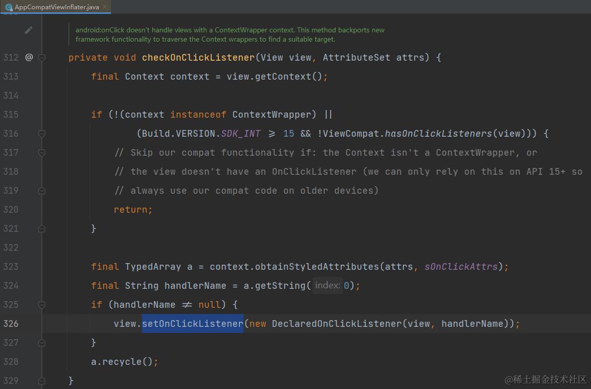 第二种方案是对 AppCompat 包中的 AppCompatViewInflater 类进行 hook。目前大多数情况下我们使用的 Activity 都会继承于 AppCompatActivity, 而 AppCompatActivity 会通过 AppCompatViewInflater 来解析生成 View 对象,内部会尝试代理 onClick 属性并为 View 设置一个自定义的 OnClickListener。由于 AppCompatViewInflater 属于依赖库,Transform 可以通过扩大作用范围从而扫描到 AppCompatViewInflater 类,所以我们对 checkOnClickListener 方法或者是 DeclaredOnClickListener 类进行 hook 都可以
