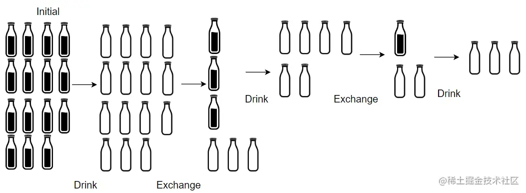 起始有 瓶酒,因此 ,此时空瓶子个数为 ,当且仅当空瓶子个数 大于等于兑换个数 时,可以继续喝到酒(能够更新 ),兑换后得到酒的个数为 ,剩余空瓶子个数等于「兑换酒的个数 」和「兑换后剩余的酒瓶子个数 」之和。