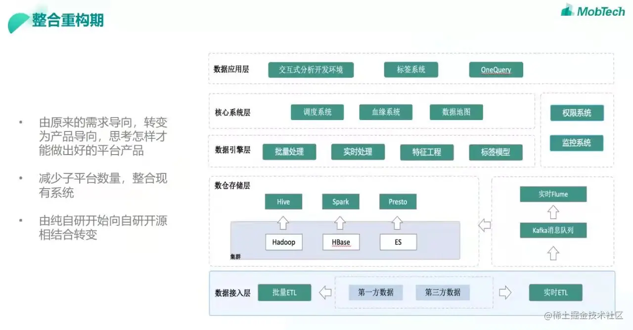 历经9年发展,MobTech袤博科技现已覆盖全球近155亿+移动端设备,业务覆盖营销、金融、商业地理等多个垂直行业,同时为政府业务提供支持。公司从2015年,组建专门的大数据部门,选择了业界主流的计算平台构建大数据平台。在经过一段的时间发展之后,基础架构已经无法满足业务的需求,大数据PaaS平台架构演变之路就此开始。后面从起步期、快速发展期、整合重构期,三个不同阶段中的探索思路、落地实践以及优化思考,阐述了企业大数据PaaS平台架构的演变。