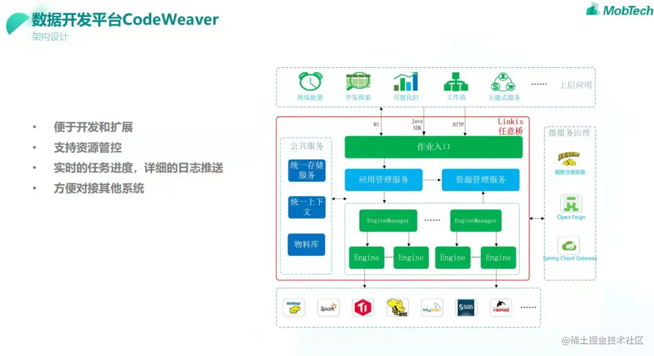 另外一件事情就是开源。之前提到开发人力不足,缺乏价值产出的问题,是很多公司都会遇到的问题。我们的思路就是,寻找一些优秀的、社区活跃的开源产品来进行二次开发,开源与自研相结合的方式。我们引入了由微众开源的数据开发中间件Linkis(内部代号CodeWeaver),以替代原先的自助查询平台和交互式IDE,提供一站式的数据开发服务。近期我们也在使用Dolphinscheder作为我们调度系统的升级。