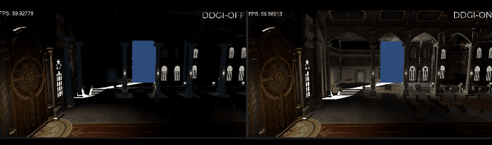 通过上面两张效果图的对比,我们可以直观的感觉到,左侧图中光照效果比较生硬和单一,不符合实际视觉效果,而右侧开启DDGI后,画面的真实感更强,有更多的细节。